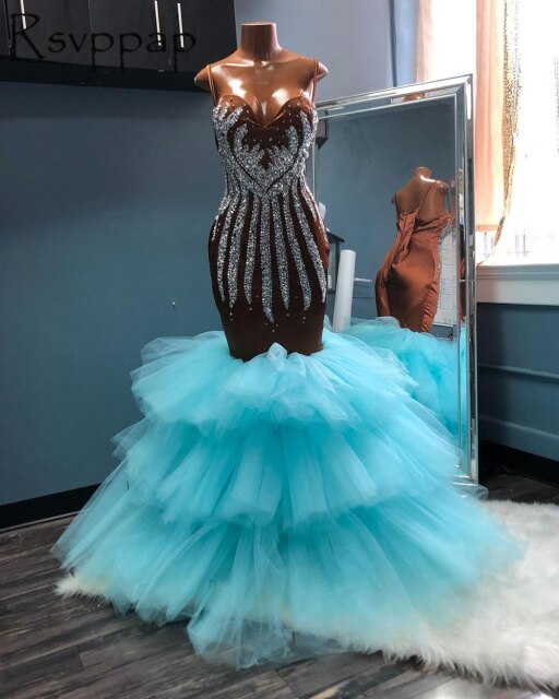 Long Mermaid Prom Dresses 2022 African Style Contrast Blue/Brown Exquisite Beaded Top Sleeveless Tiered Girl Party Prom Dress